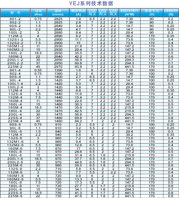 YEJ系列制動電動機是全封閉自扇次冷式鼠籠型具有附加圓盤直流制動器的三相異步電機,它具有制動快速,結構簡單,可靠性高,通用性強等優點。此外制動器具有人工釋放機構,被廣泛用于各種要求快速停止和準確定位的機械設備和傳動裝置中。